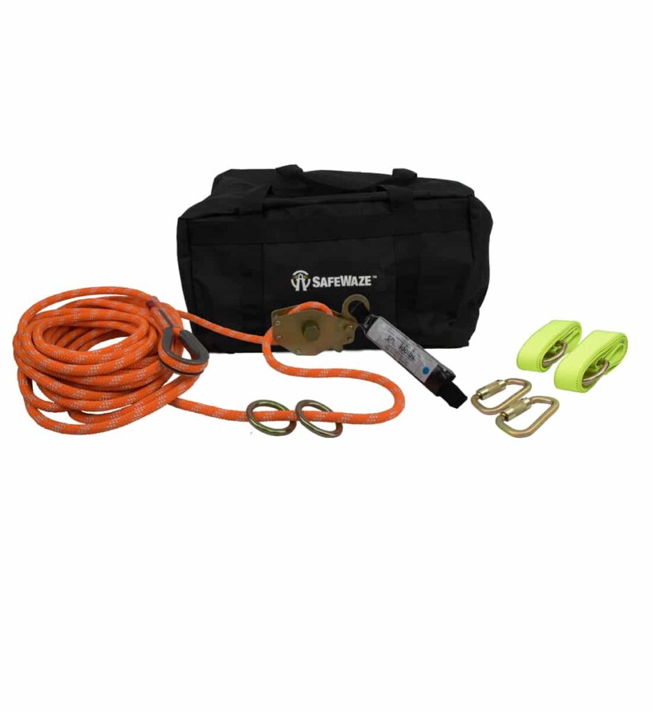 The 019-8000 2 Person Rope Horizontal Lifeline Kit comes with a 30? kernmantle rope with 2 o-rings, rope tensioner, 2 carabiners, and an energy absorber with protective cover. All of the kit components fit in the carrying and storage bag. Additional rope lengths options are available to cover applications from shorter roofing environments to larger span job sites.