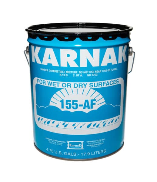 KARNAK #155 Amphibikote is a carefully prepared, emergency roof cement with special water displacing characteristics, which ensures an effective bond to both wet and dry surfaces. The ability to adhere during inclement weather conditions makes KARNAK #155 Amphibikote the first choice of both roofing contractors and plant engineers. KARNAK #155 Amphibikote is composed of selected asphalts, mineral fillers combined with refined solvent, and special chemical ingredients which give it a unique water displacement quality. Available in three consistencies: Summer, Semi and Winter.